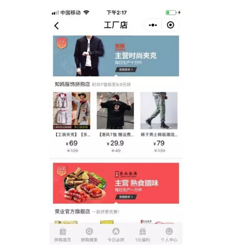 查看了拼多多、苏宁拼购APP,发现其目前的产品首页并没有类似京东拼购的工厂直供频道页。在拼多多或苏宁拼购平台上,用户如需寻找工厂品牌,需要搜索“工厂品牌”才会出来工厂店,并且这两个平台也没有“拼购店”的工厂店铺字样。