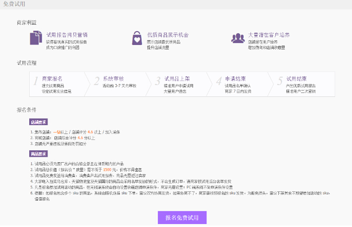 其次还有可以报名官方的试用,能够参加的商家可以去报名哦,有助于提升我们的转化率。
