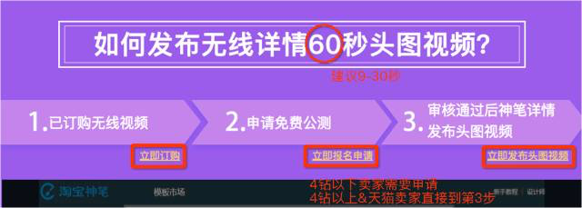 (1)现主图视频已向所有天猫商家和集市4钻及以上(含4钻)商家全部开放,无需商家申请。未到4钻的商家需要联系行业小二申请开通(需要订购无线视频);