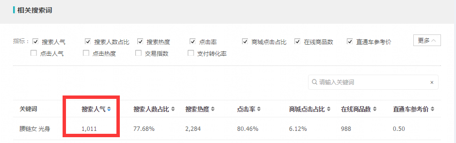 腰链女 光身这个词7日 1011搜索人气。 我们从这个词获得了较多的曝光,搜索点击,我们在这个词下的转化高于市场,但是长时间流量不再增加,这样就证明我们的引流达到了临界点,就需要优化我们的标题,突破流量瓶颈。